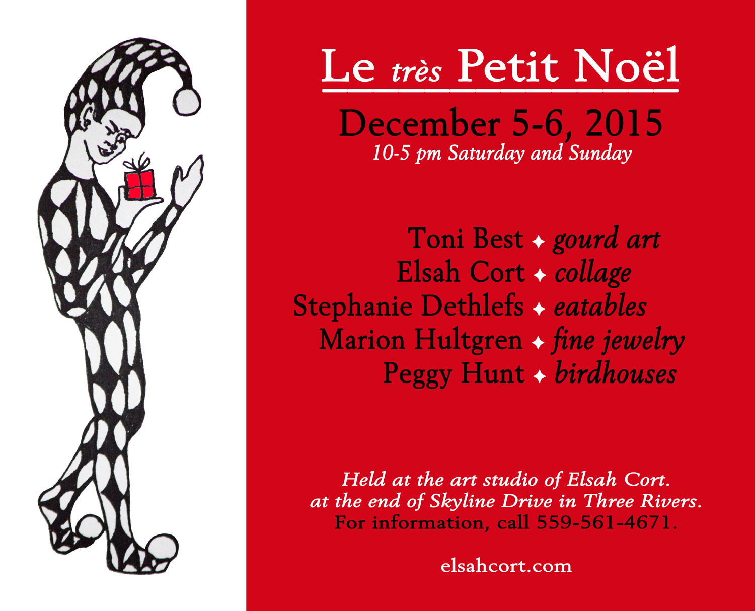 Many years ago (in another lifetime) I organized a special annual holiday event, called Le Petit Noël, which was held on Thanksgiving Weekend. It was a special time to celebrate wonderful local art and encourage local shopping for Christmas. Now, 20 years later, I am hosting a mini-version of this event at my art studio. Toni Best, who was an artist in the original show, will be showing her amazing gourd art. My dear friend, Marion Hultgren from Atlanta, is bringing exquisite jewelry and some creative ornaments. My sister, Peggy Hunt, will have birdhouses made for real birds. Stephanie Dethlefs is bringing mulling spices (for sampling and buying) and other delicious eatables. I will have some vintage gift tags from the original Le Petit Noël (yes, I saved them) and new mandala cards and my digital collages.