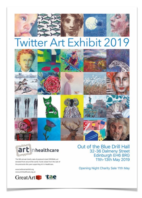 The Twitter Art Exhibit was started ten years ago and has been held each year in different locations. Each year the proceeds of the sale go to help a special non-profit organization. In 2019, it goes to support Art in Healthcare, “an Edinburgh based charity whose core aim is to have ‘a Scotland in which visual art improves health and keeps people well’. Art in Healthcare works closely with a broad cross section of healthcare providers in hospitals, GP surgeries, community care groups, hospices, healthcare centres and other bodies involved in the provision of healthcare to run a series of carefully tailored art workshops throughout the year. The programme of art workshops which is led by professional artists and aided by volunteers,have grown steadily since 2011 enabling Art in Healthcare to reach a broader cross section of patient groups. In addition the charity has a large collection of contemporary artwork which is displayed in healthcare premises across Scotland.”