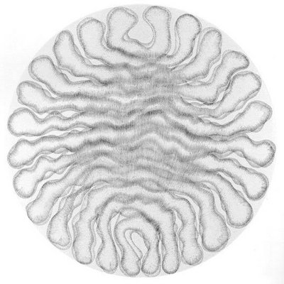 He writes about it with these words, “Since 1970, all of my drawings have been made with just one kind of mark. I put the pen on the paper and flick it. The split-second acceleration of the penpoint attenuates the flow of ink so that the mark tapers, then breaks into tiny skips, and then disappears completely. This leaves a straight comet-shaped track about 1-2 cm long. No two marks are exactly the same, but their diversity is strictly limited. Most of my drawings contain thousands of marks.”